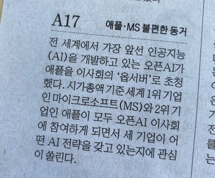 전 세계에서 가장 앞선 인공지능을 개발하는 오픈 AI가 애플을 이사회의 '옵서버'로 초청하면...