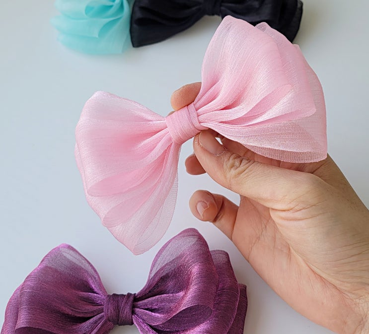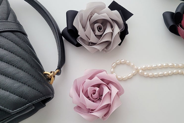 즐겨 사용하는 80mm 원단리본으로 만든 왕리본핀이에요. 요즘은 왕리본핀들의 크기가 점점 커지는 추세라서...