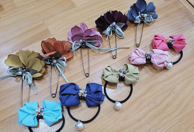 언젠가 색감이 너무 예뻐서 단체로 구입했던 독특한 질감의 리본으로 언발란스한 리본핀을 만들었어요. 날...