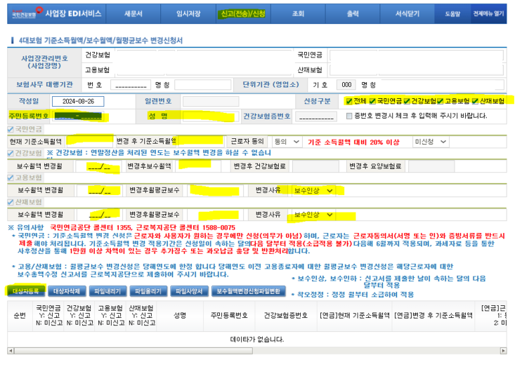안녕하세요. 오늘은 건강보험 EDI에서 사대보험 보수총액을 변경하는 방법을 안내드리겠습니다. 1. 건강...