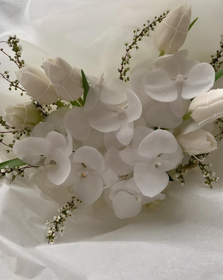 올화이트로 이루어진 부케예요 작약은 활짝피워서 베이스로 사용했어요 활짝핀 작약은 풍성한 매력이 있어...