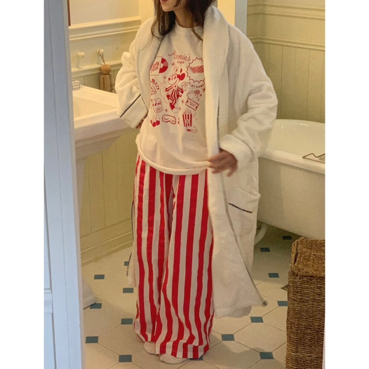 (국산) 디즈니 캐릭터 화이트 순면 긴팔 티셔츠 스트라이프 파자마 팬츠 투피스 잠옷 세트 미키 우정 홈웨어