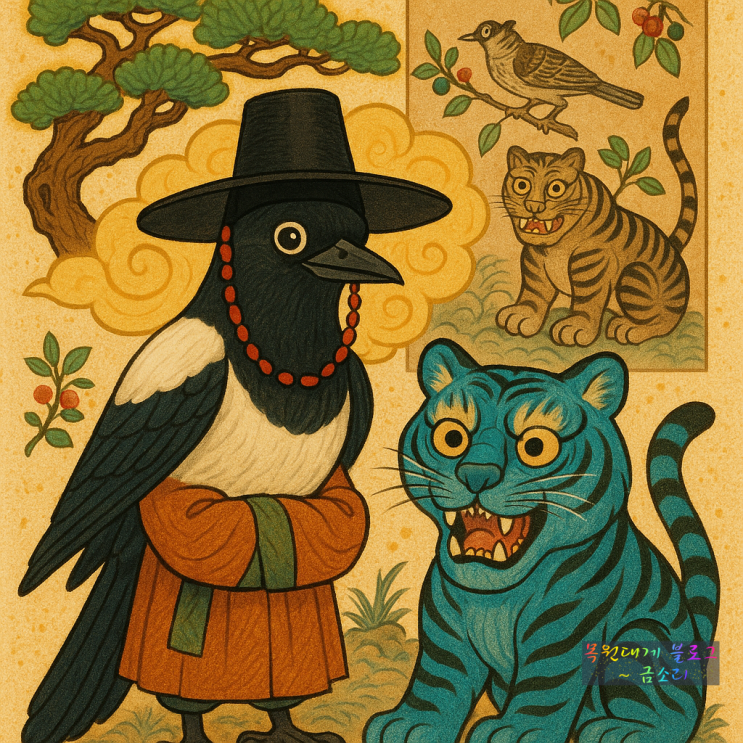 민화 속에서 튀어나온 케이팝 데몬헌터즈 까치 서씨와 파란 호랑이 더피 호작도