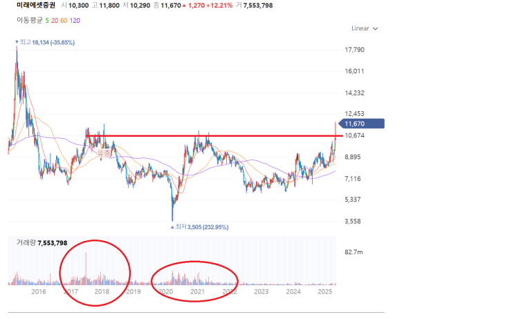 미래에셋증권, 전고점을 강하게 뚫는 모습
