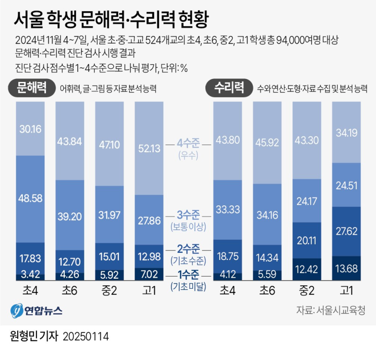 서울 고1 41% 기초수리력 '보통이하'…"학년 오를수록 수포자↑"(종합)_ 연합뉴스 2.1...