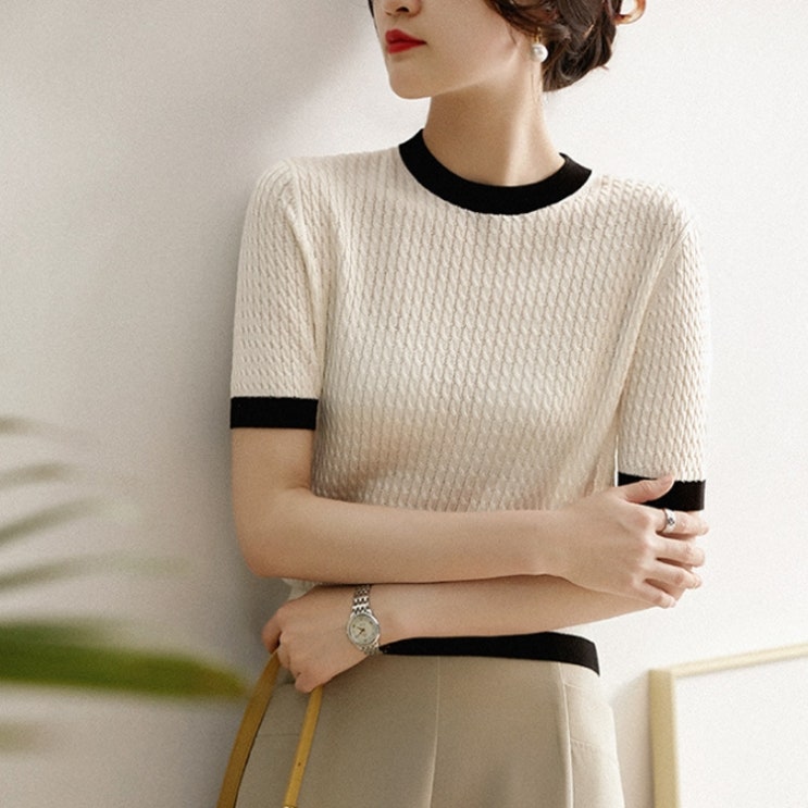 #소프트 #잔잔한 #꽈배기 #니트 #반팔 #티셔츠 #여성 #심플 #데일리 #단아한 #라운드넥 #시보리 #배색 #니...