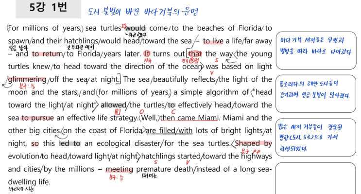 ◆ 직독직해 해석 For millions of years, / sea turtles would come / to the beaches of Florida / to ...
