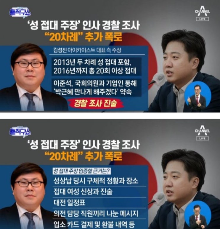 ‘성 접대 주장’ 인사 경찰 조사…“20차례” 추가 폭로 - 김진의 돌직구 쇼 준서가 너도 이쯤에서 빵 한 ...