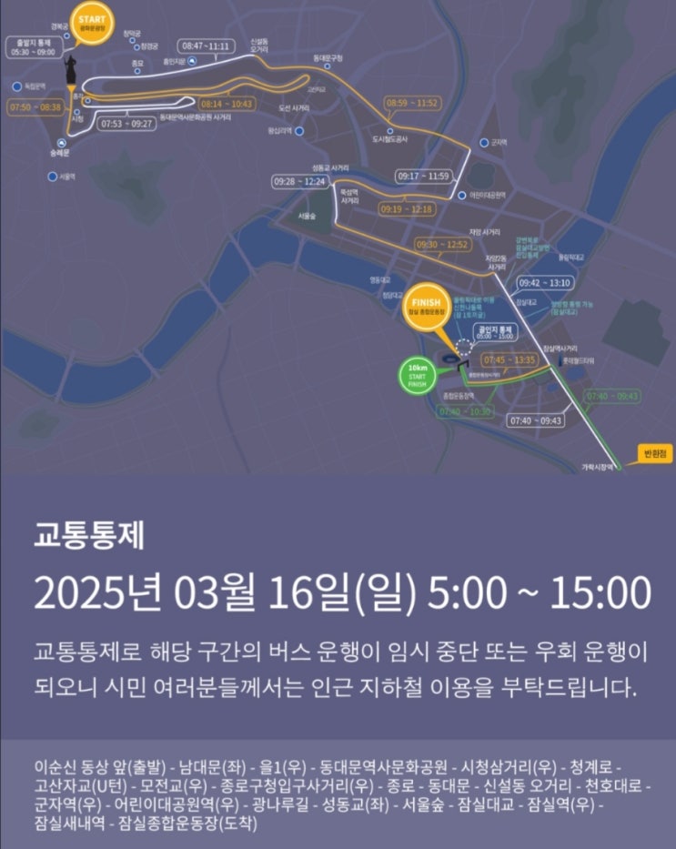 서울마라톤 서울 교통통제 2025년 3월 16일 일요일:광화문광장-군자-잠실