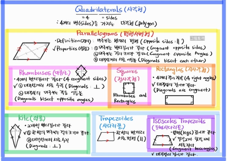 Geometry에서 Quadrilateral(사각형)의 종류와 그 성질들을 간략히 정리해볼게요. Quadrilateral은, 4개...
