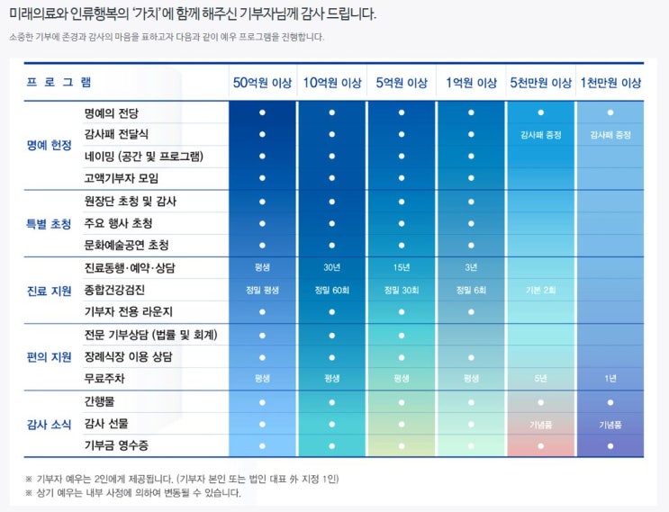 메이저 빅4 대학병원 기부자예우 프로그램