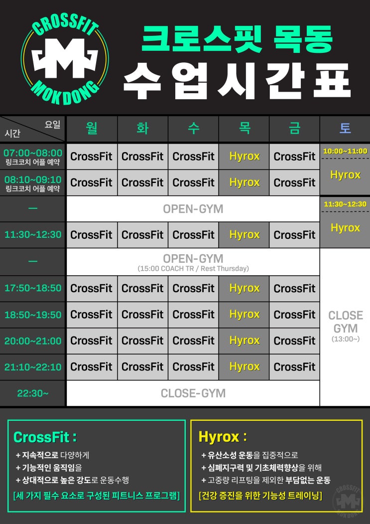 안녕하세요, 크로스핏 목동입니다:) 23년 11월 6일부터 아래 시간표로 변경됩니다. 크로스핏과 하이록스 수...