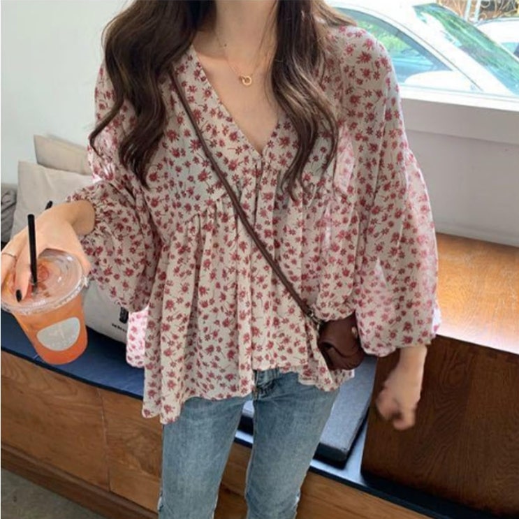 #플로라 #플라워 #7부 #셔링 #블라우스 #여성 #A라인핏 #셔츠 #우아한 #퍼프소매 #브이넥 #언발 #티셔츠 #...