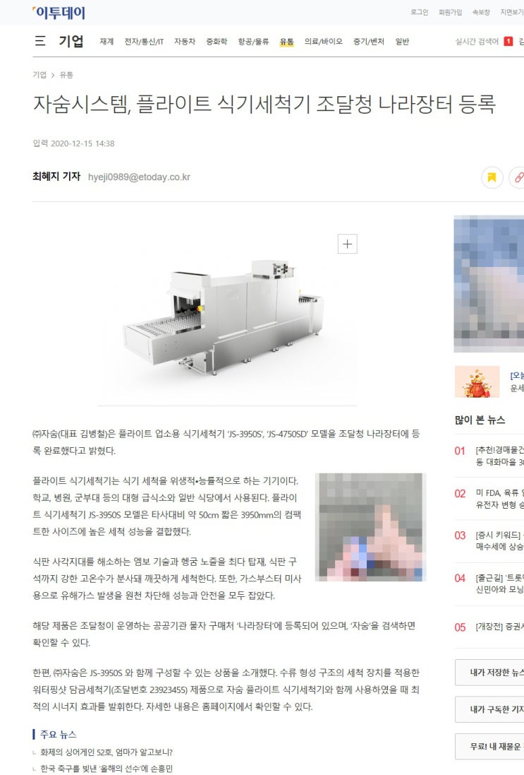 조세일보에 자숨엠보세척기관련 기사가 보도되었습니다~ 식판각도조절 기술을 적용한 자숨엠보세척기가 성...