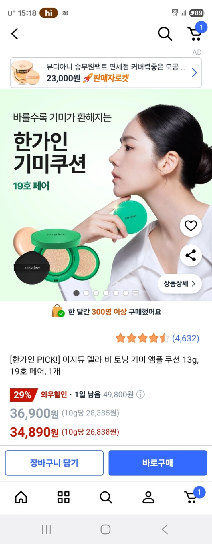 네이버, 틱톡에서 엄청 광고하길래 사본 한가인 기미쿠션:이지듀 멜라 비 토닝 기미 앰플 쿠션 19호 실제로...