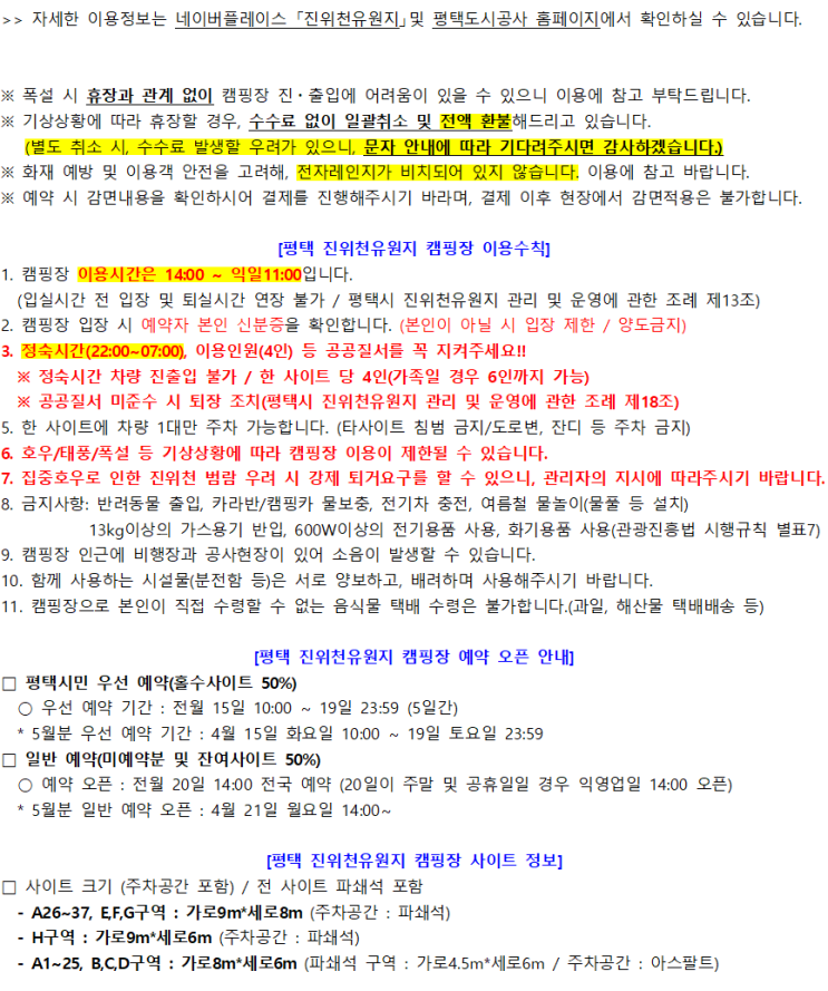 평택 진위천유원지 캠핑장 정보, 예약방법, 가격, 사이트 크기