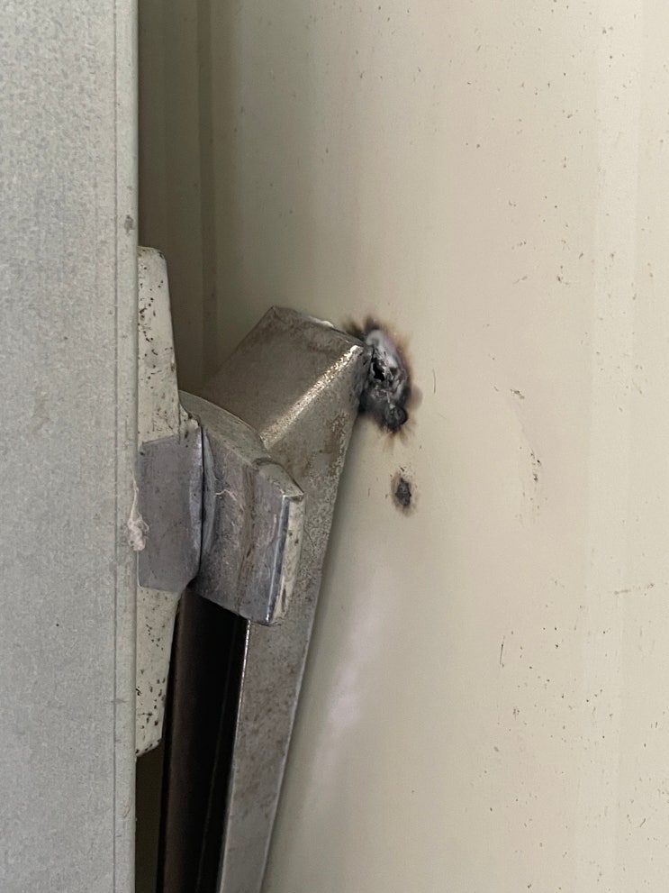 2025.08.18. 전남 순천. 건조기 문을 여닫을 때 문짝이 바로 옆 벽면에 닿으면 불꽃이 나면서 차단기가 떨...