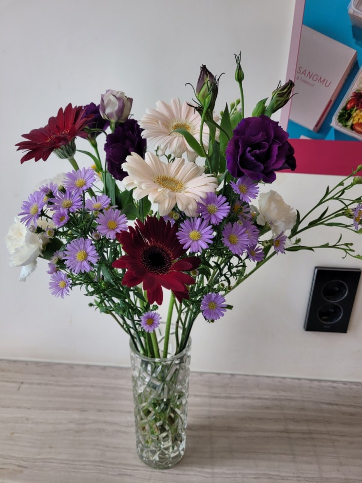 오랜만에 생화를 보았네요 꽃다발을 이렇게 꽂아두니 분위기도 있고 너무 아름답니다 리시아셔스꽃이 눈에 ...
