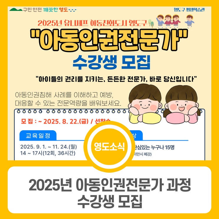 2025년 아동인권전문가 과정 수강생 모집 ✅모집인원 : 15명 ✅교육기간 : 2025. 9. 1. ~ 11. 24.(월) 14 ~...