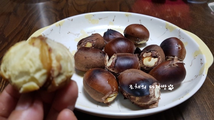 군밤을 굽기 위해 이렇게 준비해보았습니다. 물에다 잠시 담 그어다 밤 까는 가위로 양쪽 모서리를 ...