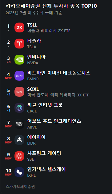 카카오페이증권에서 제공한 7월 한국 투자자가 많이 매수한 미국 주식 TOP 10. 7월 미국 주식 TOP 10...
