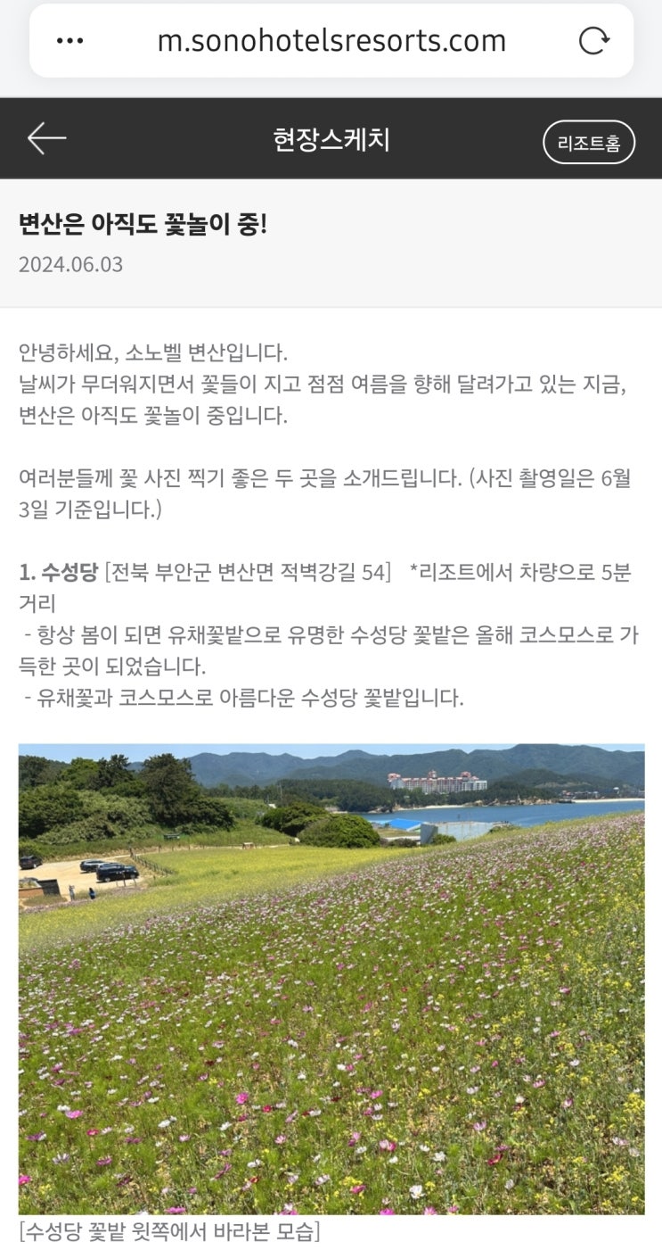 전날 소노벨 변산에서 하루 묵고, 어디 뭐 볼 거 없나 주변 찾아보니 소노벨 변산 홈페이지에 수성당 유채...