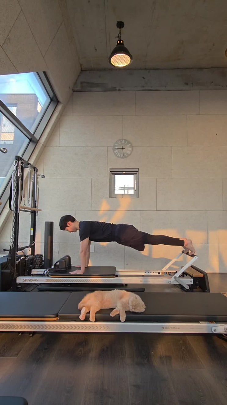 안녕하세요 필라피티스튜디오입니다! 오늘은 리포머에서 하는 런지를 보여드리겠습니다. 리포머 바닥(캐리...