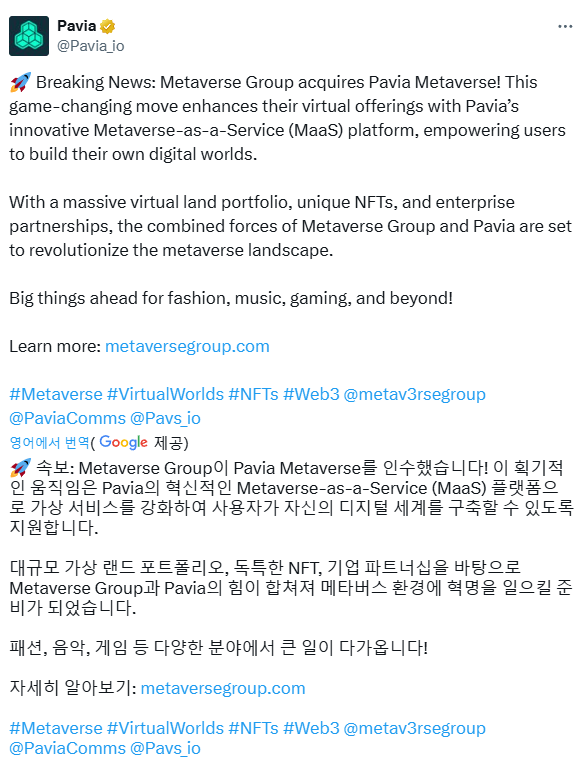 파비아 Pavia : 메타버스 그룹 Metaverse Group 에 인수 (24.11.18)