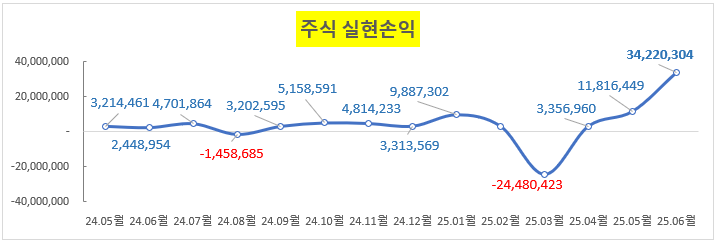 25년 06월 #금융투자결산 이다. 6월 실현수익은 34백만원으로 미국주식 SOXL이 10불 이하일때 중기 투...