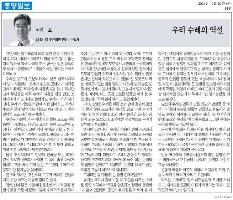 “조선에는 짐수레같이 바퀴 달린 운송 수단이 전혀 없었다. 게다가 가축조차 짐을 지고 갈 수 없는 길이 ...