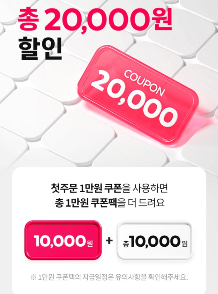 간단하게 설명드릴게요 첫 가입하시면 총! 2만원 쿠폰! 첫 주문시 1만원 주문 완료 후 쿠폰이 또 1만원 총 ...