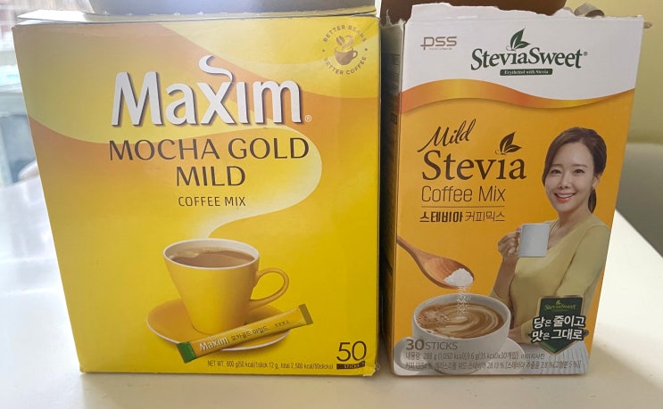 맥심 모카골드 마일드 & 스테비아 커피믹스 칼로리 영양정보 비교