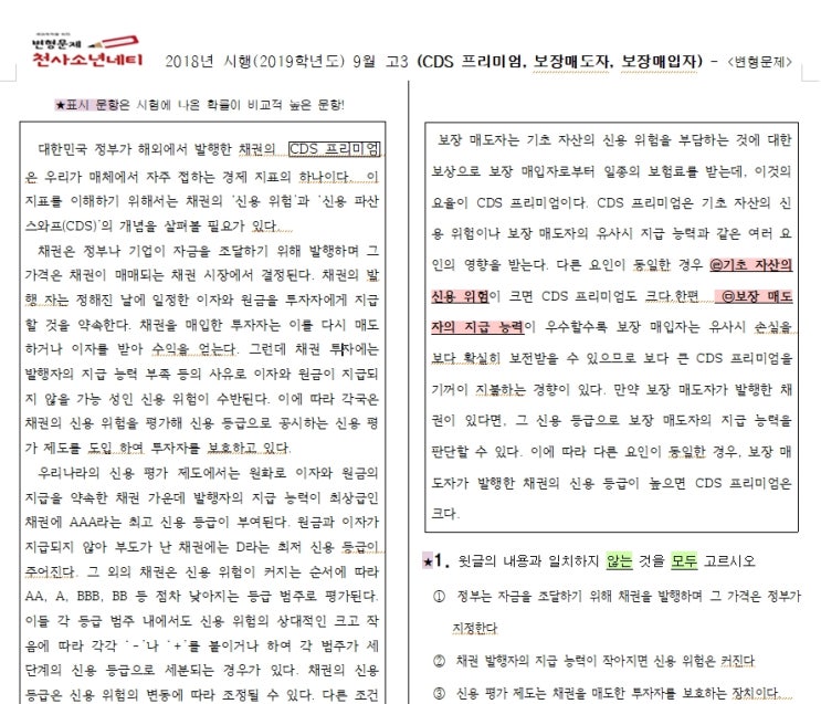 19학년도(18년시행) 고3 9월 국어 모의고사(CDS프리미엄, 보장매도자,보장매입자,최고신용등급) 문제 한글파일 21번~25번