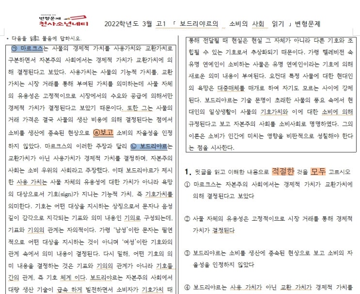고1 3월 국어 모의고사 변형(보드리야르)
