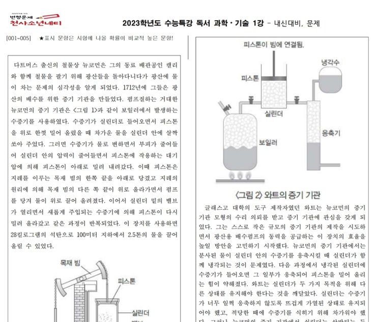과학1강 EBS 수능특강 독서 과학, 기술1강 내신대비문제 (뉴코먼, 증기기관, 와트, 응축기, 실린더, 월...