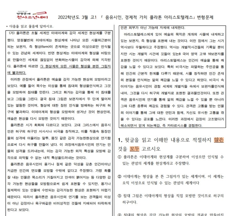 3월 고1 독서 음유시인 변형문제(플라톤, 아리스토텔레스)비문학