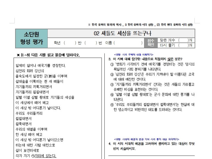 새들도 세상을 뜨는구나 - 현대시 문제 2009교육과정 고2 문학 천재(김) 내신 교과서 평가문제 첨부 파일(...