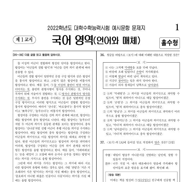 2022년 예시문항, 화법과작문, 언어와 매체 문제 및 정답(고3)