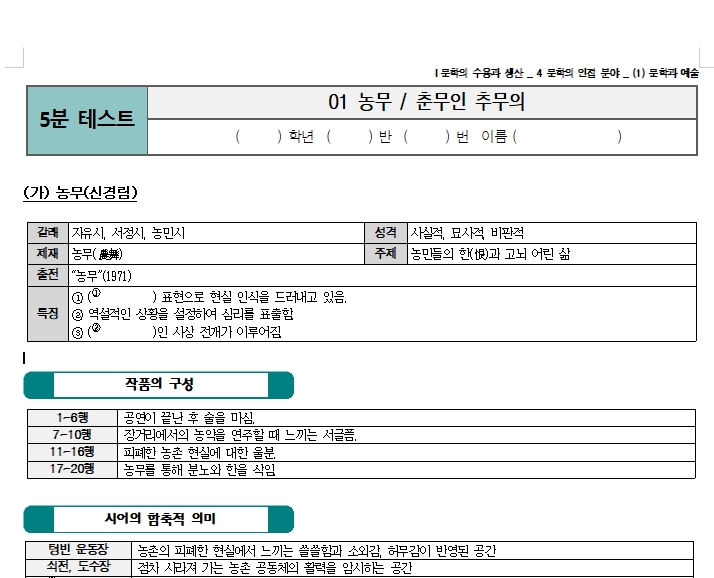 농무 / 춘무인 추무의 - 현대시 문제 2009교육과정 고2 문학 천재(김) 내신 교과서 평가문제 첨부 파일(평...