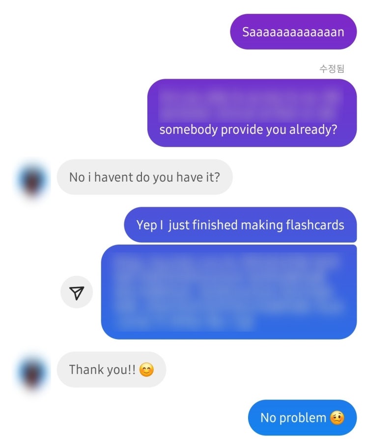 어제 저녁에 눈을 비벼가면서 플래시카드를 만들고 나서 혹시라도 샌이 애들한테 이걸 못 받았을까봐 물어...