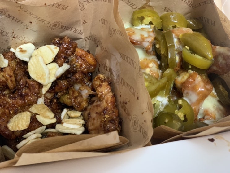 푸라닭 치킨 블랙마요 순살(블랙알리오+고추마요) 푸라닭 순살은 퍽퍽살이 아닌 닭다리살이라 넘 좋다. 블...