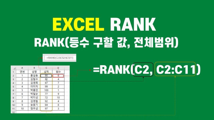 엑셀 RANK 등수 구하기_직장인 기초 엑셀 Rank 는 SUM, AVERAGE와 함께 가장 많이 쓰일 수...