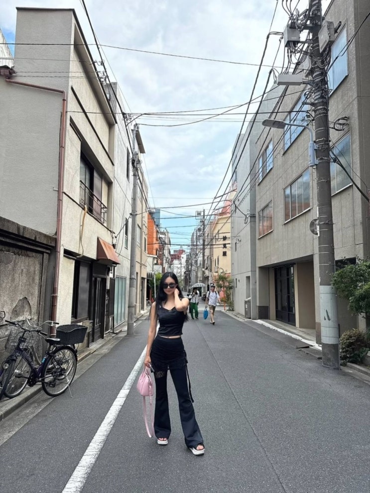 블랙 톱과 와이드 팬츠, 그리고 분홍빛 가방이 어우러진 도심 속 여유—김나희의 길거리 패션이 시선을 끈다