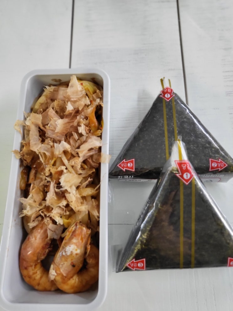 지난주에도 도시락을 건너뛰었건만.. 게을러져서 오늘 도시락메뉴는 집에서 만든 삼각김밥과 해물볶음우동...