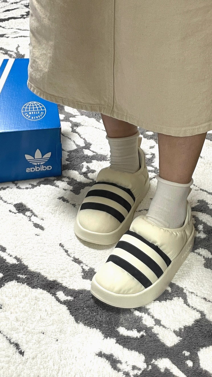 아디다스 패딩 슬리퍼 '퍼피렛' 오프화이트 실착 후기 및 사이즈 팁, 패딩신발 슬립온, 방한슬리퍼 추천