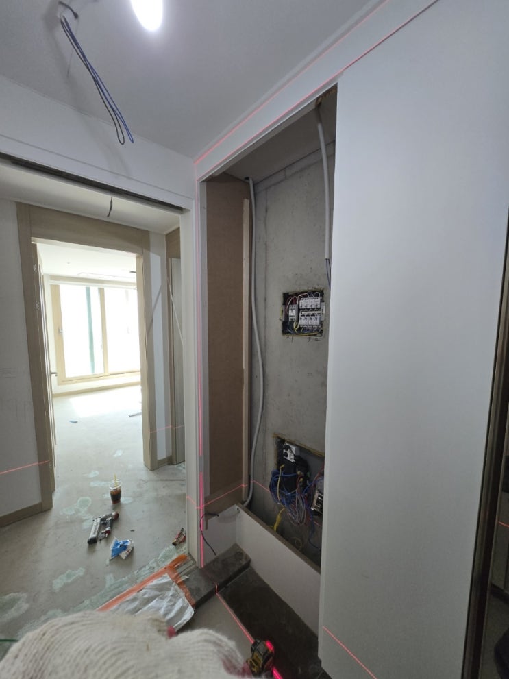 목공 2일차. 오늘은 벤치장을 짜는 날이다. 이번 인테리어 중 가장 기대되는 곳! 문제의 두꺼비집, 배전함 ...