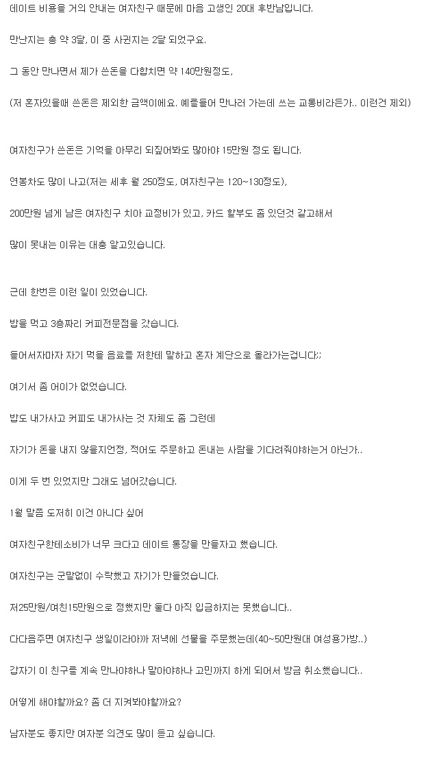 데이트 비용을 안내는 여자친구...라는 제목으로 돌아다니는 글을 봤는데요~ 내용은 아래와...