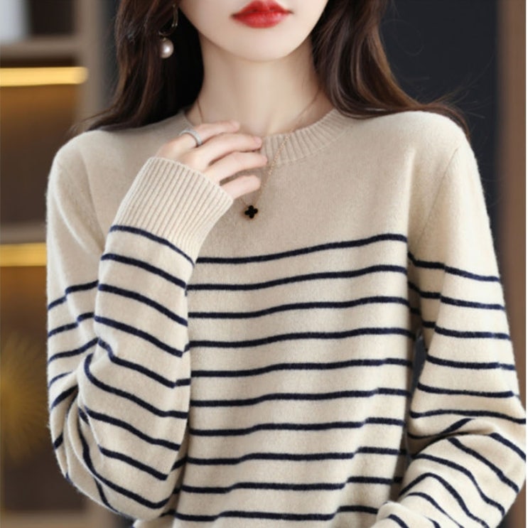 소프트 스트라이프 여성 니트티 데일리 간절기 가을 봄 심플 줄무늬 스웨터 보온 니트 티셔츠