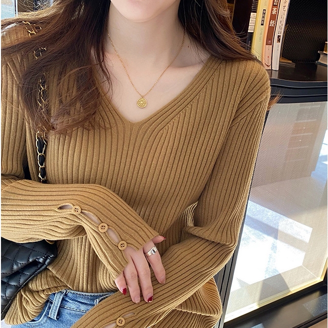 소매단추 골지 니트 티셔츠 여성 간절기 봄 가을 부드러운 시크한 레이어드 브이넥 긴팔티