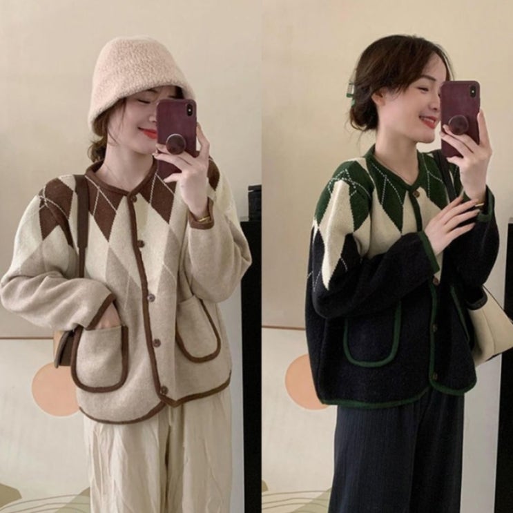 #소프트 #배색 #아가일 #니트 #자켓 #여성 #간절기 #가을 #겨울 #귀여운 #포켓 #도톰 #가디건 #단추 #아우...
